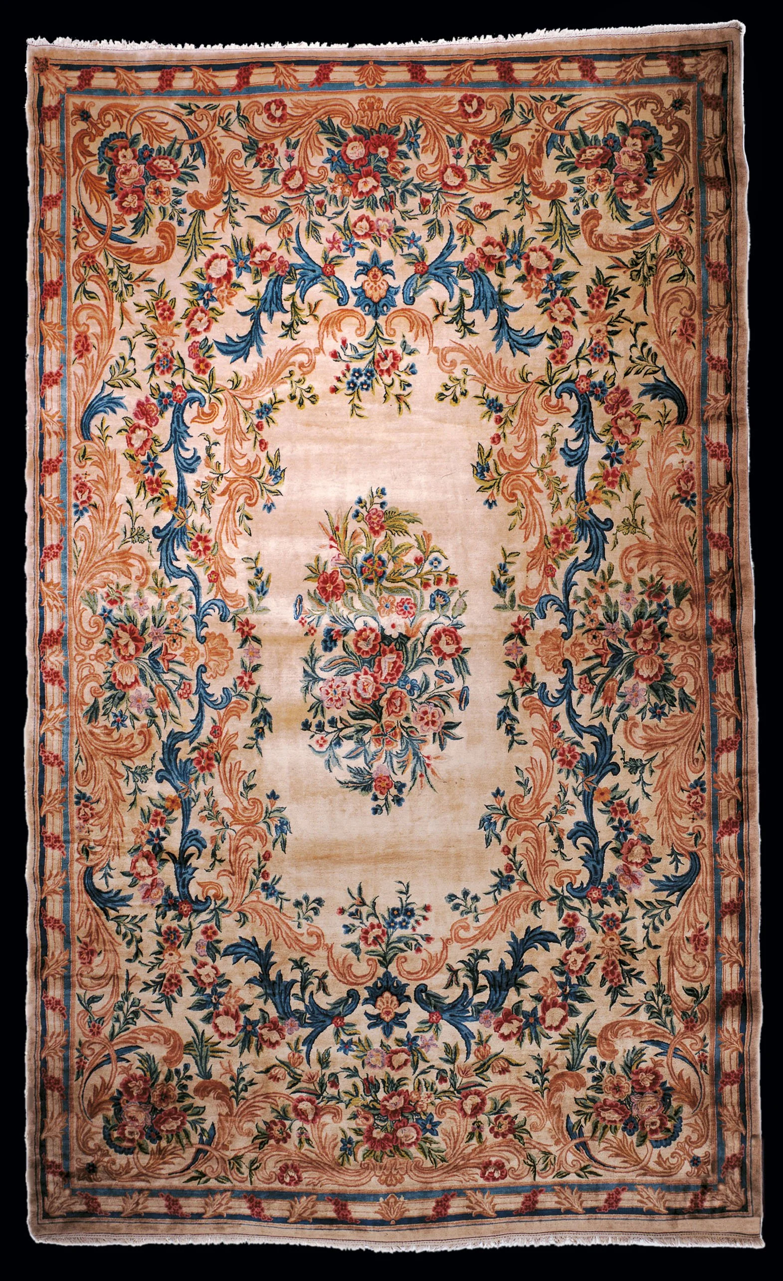 By the 19th century, Kerman had a long history of urban workshops, employed very fine Carmania wool, natural dyes, and featured a diversified design repertoire for export to western markets . The present example, most likely woven sometime in the 1940’s, display’s an obvious European design influence reflecting the contemporary vogue in French and English interiors. The weave is extremely dense, the pile luxurious and full.