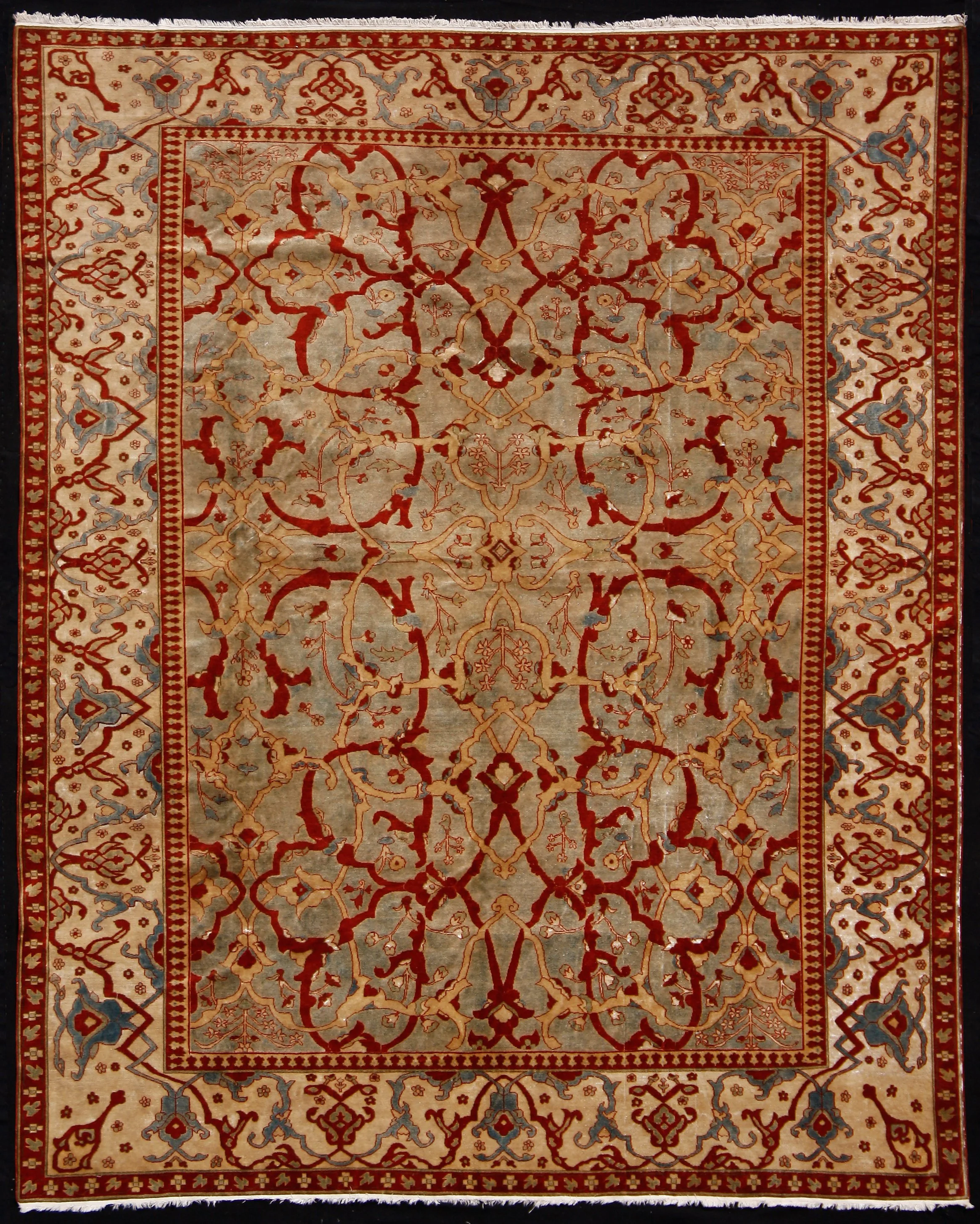High quality carpets were produced for the Ottoman Court in both Hereke and Feshâni in the second half of the 19th century. In Defterdar near Eyüp in Istanbul, a building constructed by Sultan Mahmut II for the making of Feze’s, the traditional Turkish men’s head gear, was converted to the production of fine carpets. Carpets for the Dolmabahçe Palace were produced in both Hereke and Feshâni. Few of the latter still exist and the present example displays a high density knot count and an exquisite rococo rendition of a Persian influenced design of elaborate meandering scrolling vinery and split-arabesques, a trefoil inner border, and a white field pseudo Shah Abassi or Mina Khani main border with meandering scrolls .