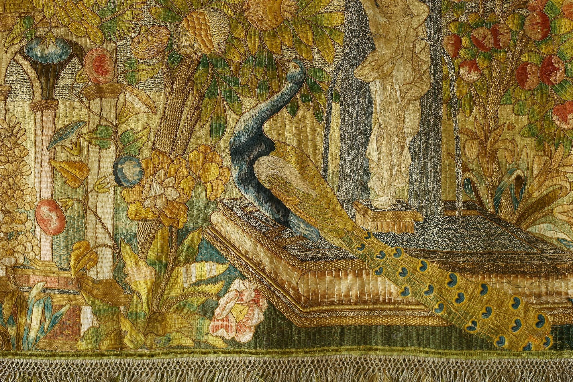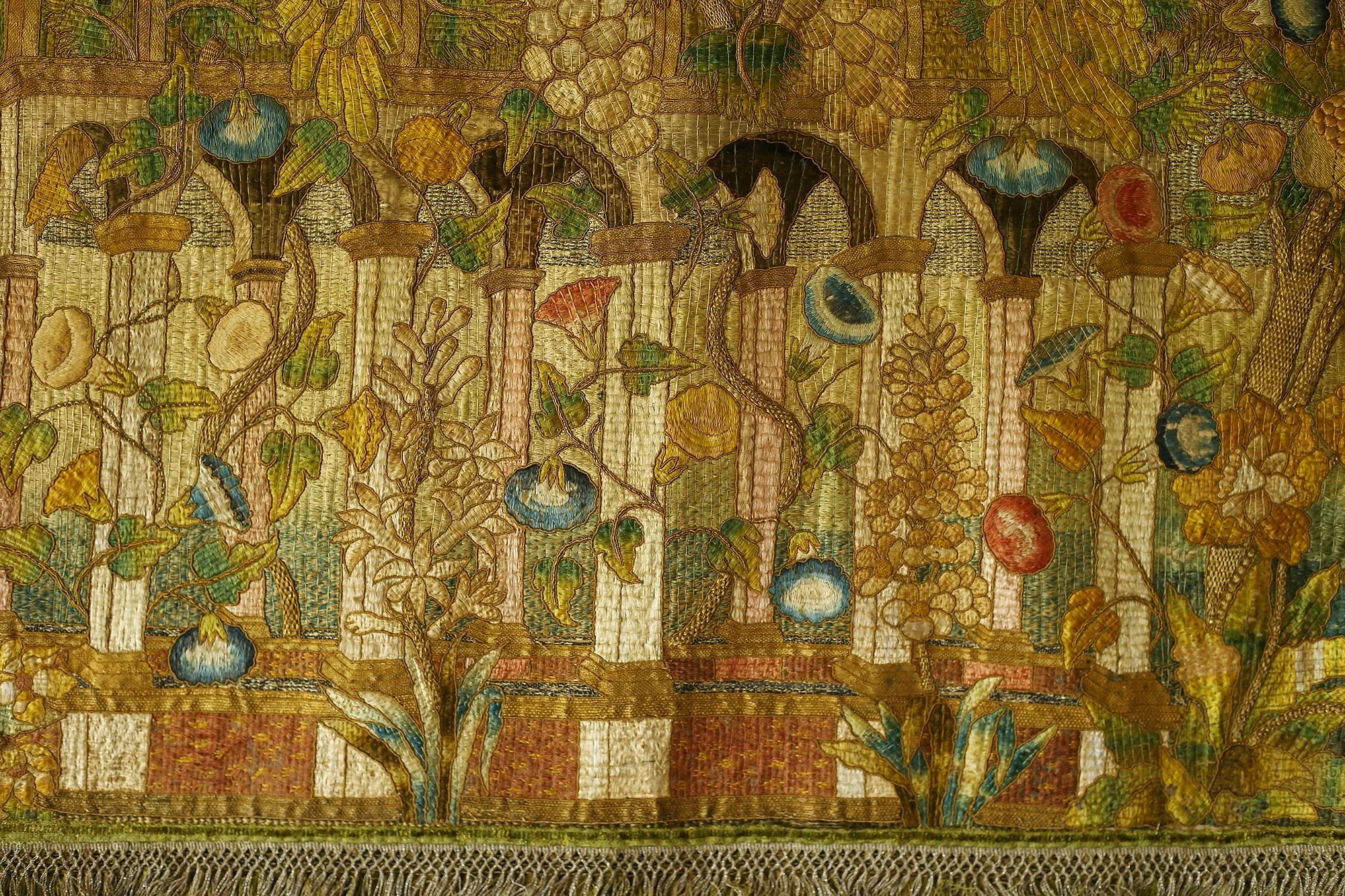 The present “valance” embroidery is a stylized depiction of the the gardens of the Palazzio de Ferrera with the Castello Estense de Ferrara top center in the composition. To the right is a marble fountain and a peacock with it’s extended plumage. A water filled canal passes through a flower and vine entwined pagoda that flows through a cypress lined passage encircling the castle and repeating to the left of the composition ending with a flowering fruit tree and a menacingly parading observant cock. Gold thread brocading is extensive throughout.
